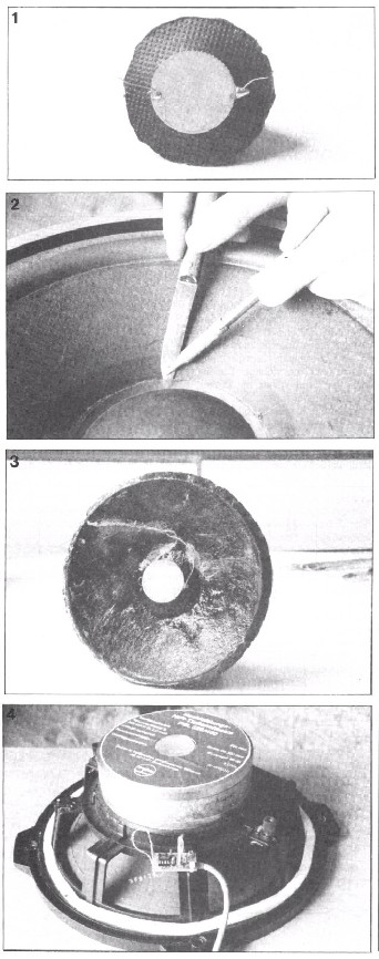 Epoxydharz mit Glasfasermatte. Im gleichen Arbeitsgang wird die Membran des Piezo -Hochtöners aufgeklebt (Foto 3).